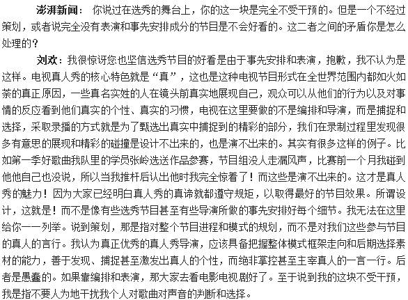 此前人民日报的微信公众号曾就中国好声音的改名事件发表评论《坚守原创,才能成就中国“最好声音”》。其实融媒君以为,原创本来就是内容生产的底线,少点故事,多点真实才是“真人秀”的卖点。只有这样,才能取得观众的信任!参加过中国好声音,后来退出又参加“中国好歌曲”的刘欢,有一次在受澎湃新闻专访时,就特别提过这个问题。