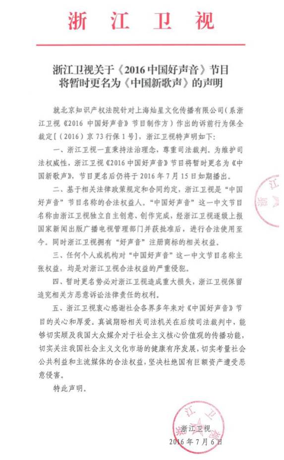 2016年1月,中国好声音的荷兰版权提供方将新一季的版权卖给了其他公司,导致《中国新歌声》的诞生。