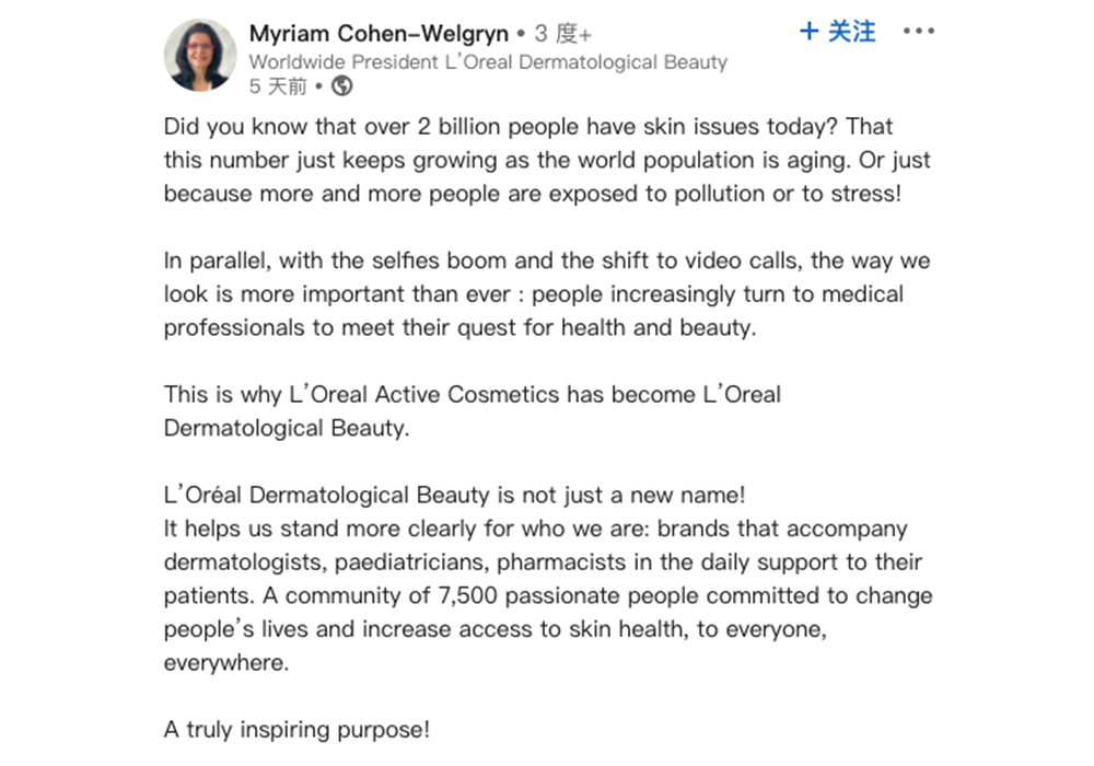 近日,欧莱雅集团活性健康化妆品部全球总裁Myriam Cohen-Welgryn,在其linkedin领英页面上发布信息称,原欧莱雅活性健康化妆品部L'Oréal Active Cosmetics,正式更名为欧莱雅皮肤医学美容部L'Oréal Dermatological Beauty。