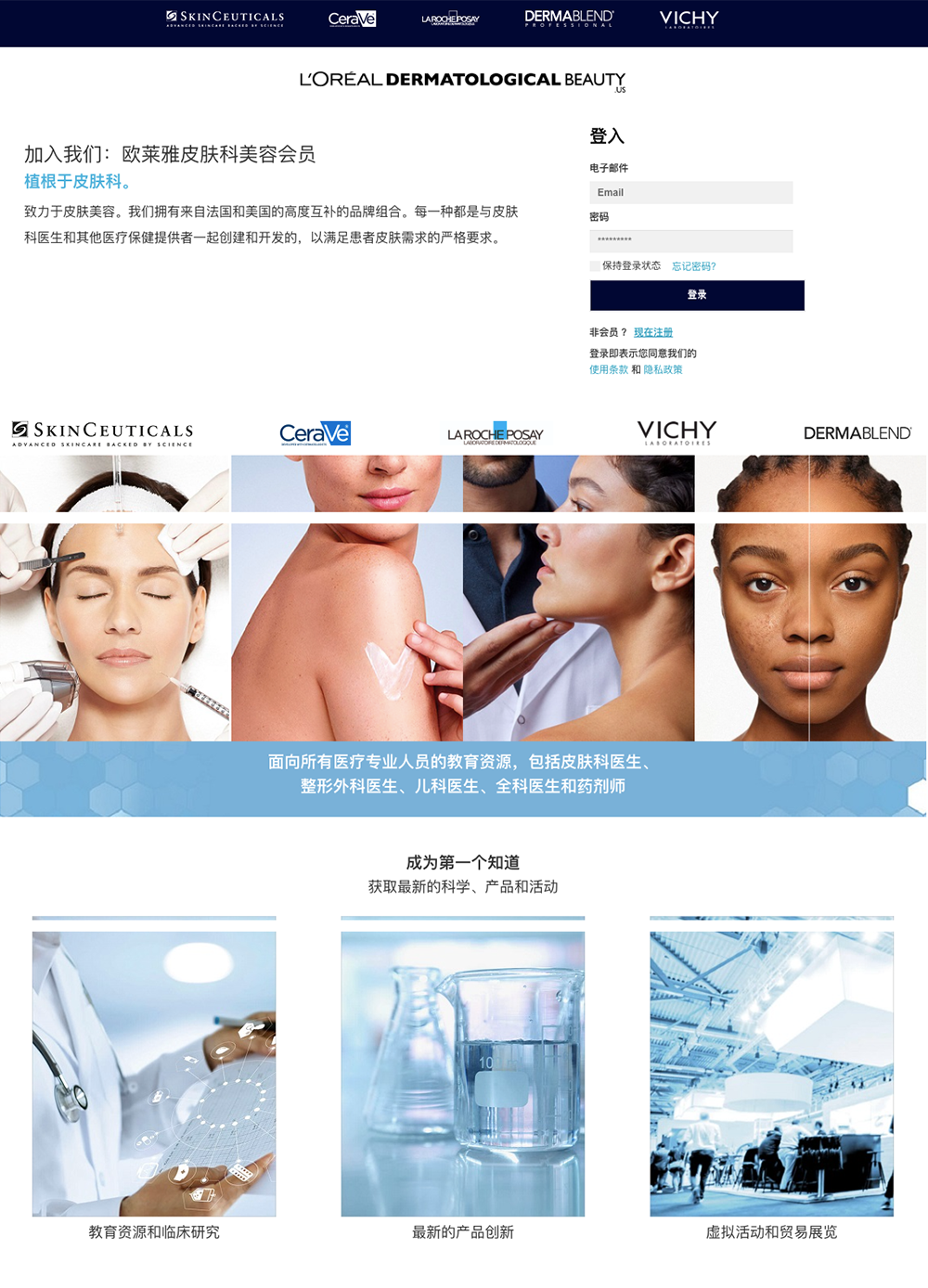 在欧莱雅集团官网中可以看到,欧莱雅的活性健康化妆品部,与全球超过180000名医生建立了信任关系:皮肤科医生、儿科医生、美容医生、全科医生……这一庞大的合作伙伴网络一是保证了欧莱雅集团能够设计和测试旗下产品,二是欧莱雅一直在践行支持皮肤病学研究、科学培训和医疗保健专业人员自身的社会行动。