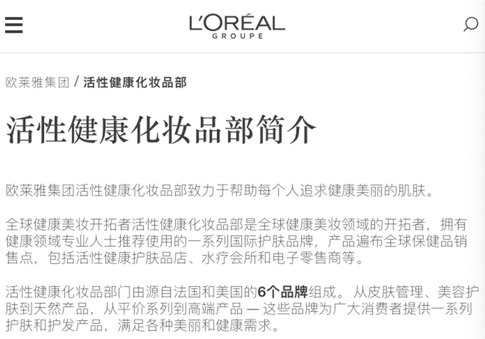 截至发稿时,欧莱雅集团英文、法文和中国区等诸多官网,均未更新这一更名,网站上依旧显示活性健康化妆品部。