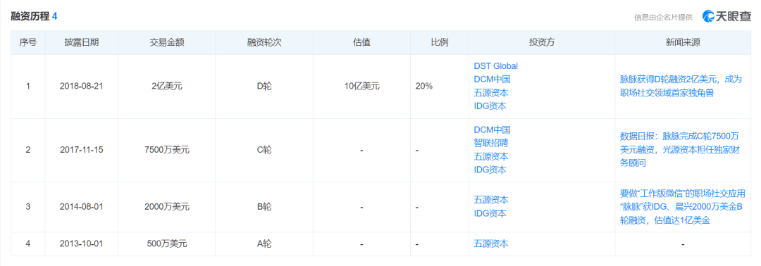 值得注意的是,2018年也是脉脉最近的一笔融资。2013年成立的脉脉一共获得了4轮融资,而最大的一轮则是2018年的D轮融资,金额达到2亿美元,估值超过10亿美金成为独角兽企业。