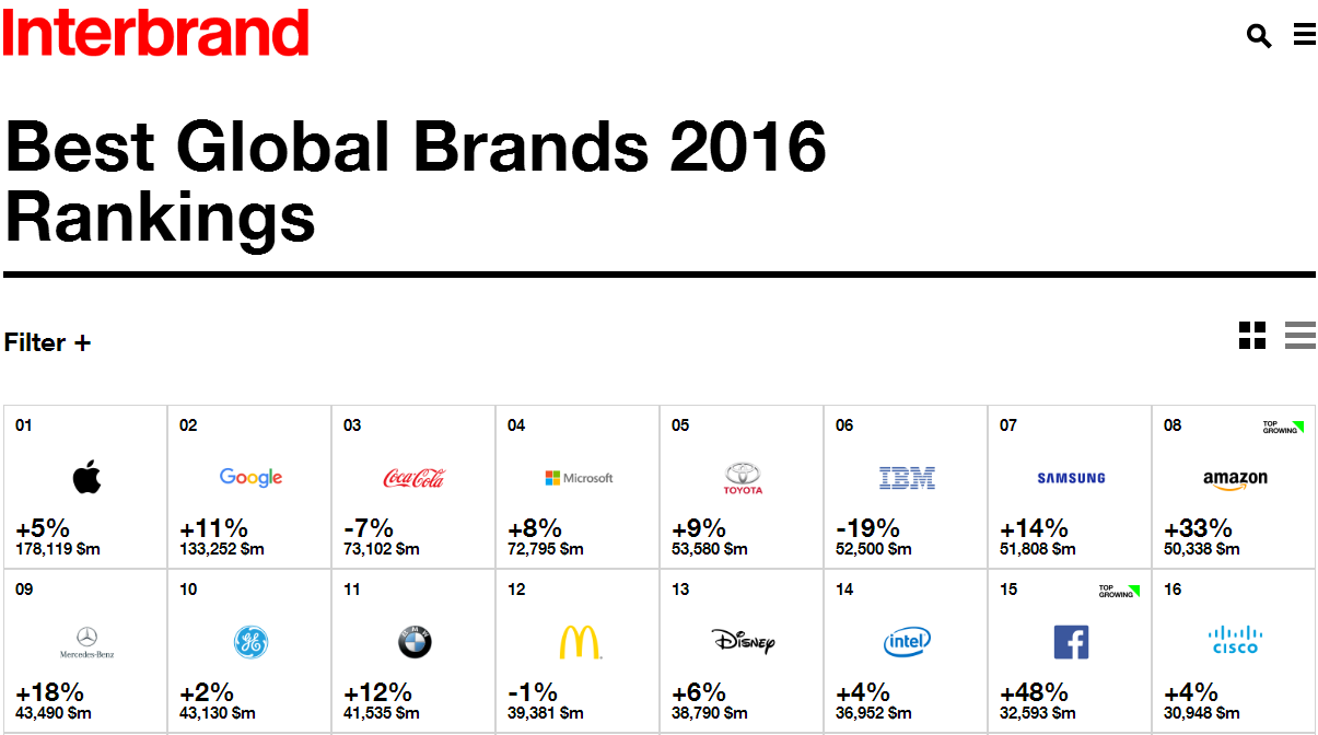 全球知名品牌咨询公司 Interbrand 发布2016年度“全球最具价值100大品牌”排行榜,苹果、谷歌、可口可乐名列前三位。进入前十名的品牌还包括微软、丰田、IBM、三星、亚马逊、梅赛德斯奔驰和通用电气。全球100大品牌总价值近1.8万亿美元。