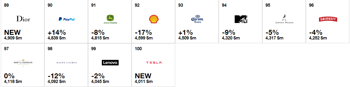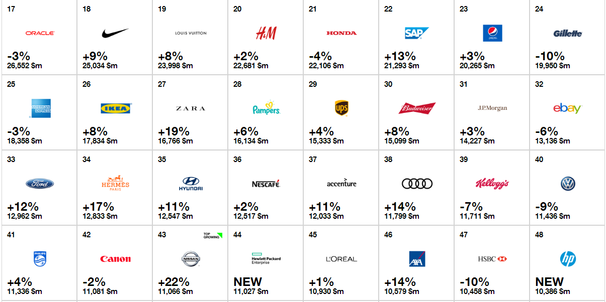 诺基亚、戴尔、万宝路、GAP、摩托罗拉、柯达、劳力士、亨氏和卡夫、Levi’s、家乐氏、UBS、哈雷……它们都从 Top 100 榜单消失了。