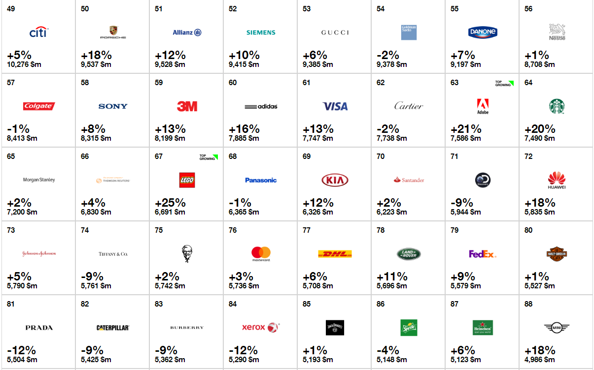 在今年的榜单中,Interbrand 还特别关注了品牌价值成长最快速的品牌。其中,表现最好的是Facebook,品牌价值比上年增长了48%。中国的华为名列品牌价值增长第十名,品牌价值比上年度增长了18%。