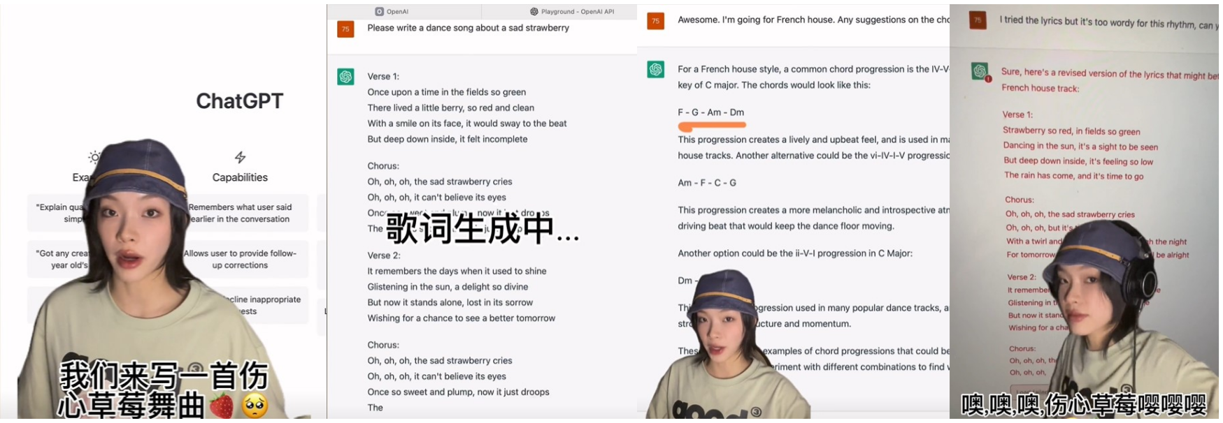 在音乐圈,也已经有音乐人基于ChatGPT进行了实实在在的歌曲创作实践。刘柏辛用ChatGPT写了一首名为《伤心草莓》的歌曲。其过程是:音乐人输入指令,ChatGPT根据指令生成歌词,并提出了对于曲创作的建议。