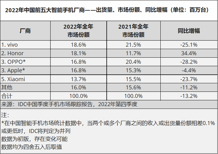 根据IDC公布的2022年中国智能手机厂商市场份额数据来看,vivo(18.6%)、荣耀(18.1%)、OPPO(16.8%)占据三甲位置,而苹果(16.8%)和小米(13.7%)则分列第四和第五名。