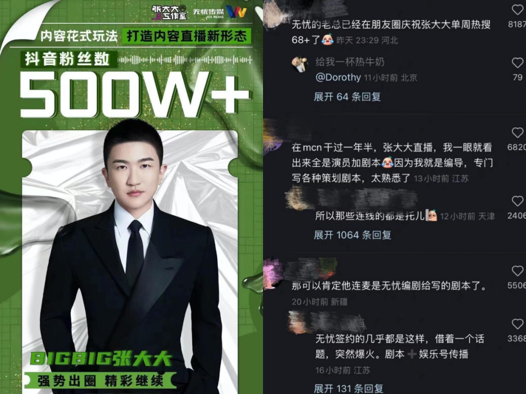 有人说他掌握了互联网流量秘诀,也有人深扒他直播间背后的“剧本高人”,不论如何,张大大是实实在在地火了,连带着他背后的无忧传媒,也一同被网友扒出,成为这场网络狂欢的最大受益者。