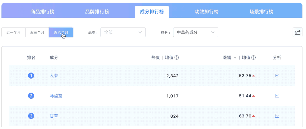 据菱歌月度美妆趋势简报22年5月刊数据显示,人参连续六个月成为中草药成分热度排行榜第一,第二、第三名为马齿苋和甘草。