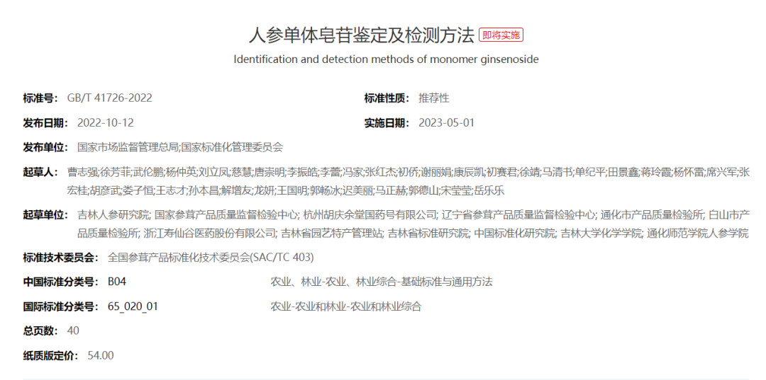 即将实施的人参单体皂苷鉴定及检测方法