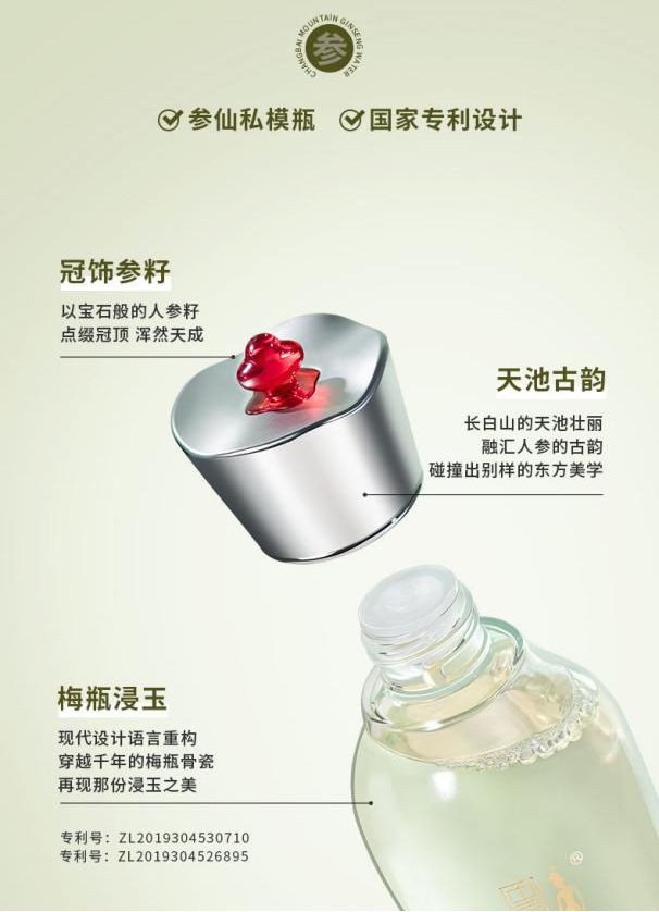 在产品方面,打造中华传统美学视觉。如获得国家外观设计专利的中草集长白山人参水,融入人参籽、天池、梅瓶等元素,并在2023年初《时尚芭莎》登上了1月刊开年杂志内页。此举向世界传播中华文化的同时,极大提升了国人对品牌的认知度和好感度,推动品牌高端化进程。
