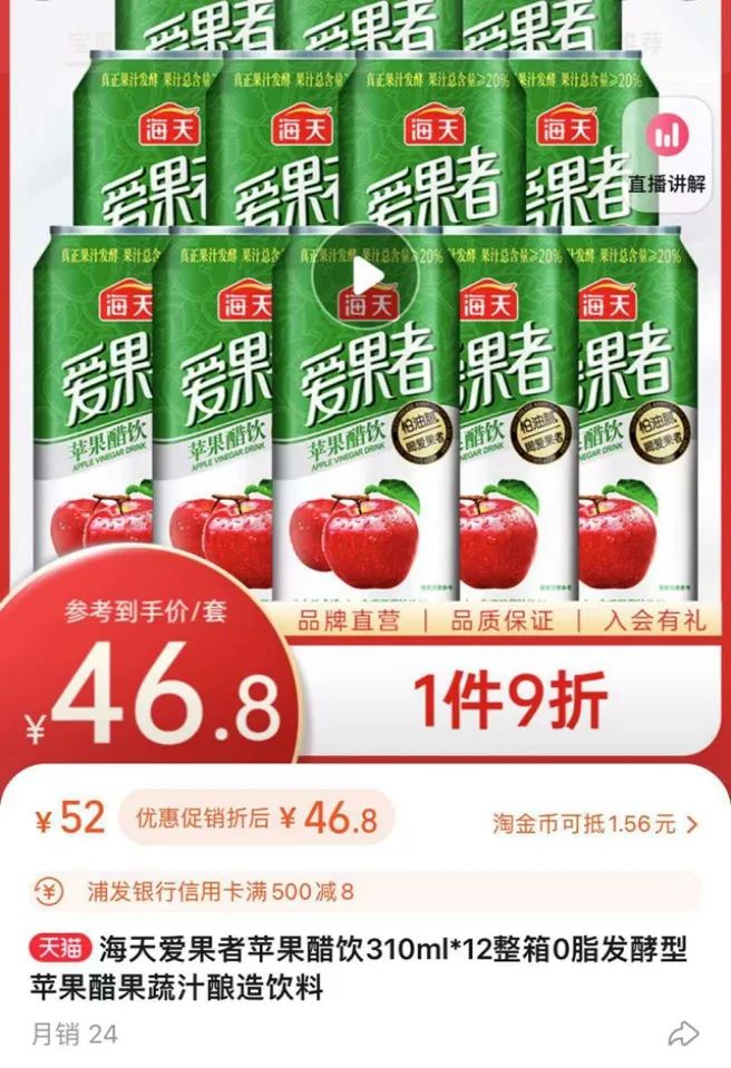 2021年3月,海天再次推出一款名为“爱果者”的苹果醋饮料,始发零售价9元左右。如今,这款产品仍在海天天猫旗舰店内售卖,但月销仅为24。