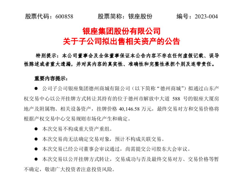 2月22日,银座股份(600858.SH)发布公告称,公司子公司银座集团德州商城有限公司拟通过山东产权交易中心以公开挂牌方式,转让其持有的位于德州市解放中大道588号的银座大厦房地产及附属物、相关设备资产,挂牌价格4.01亿元,最终交易对方和交易价格将根据产权交易中心交易规则市场化产生和确定。