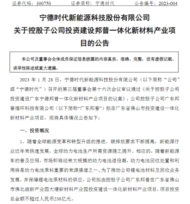 日前,宁德时代发布公告称,控股子公司广东邦普循环科技有限公司拟在广东佛山投资238亿元,建设一体化新材料产业生产基地,涵盖50万吨废旧电池材料的回收、三元和磷酸铁锂正极材料的生产、负极再生石墨制造等项目。