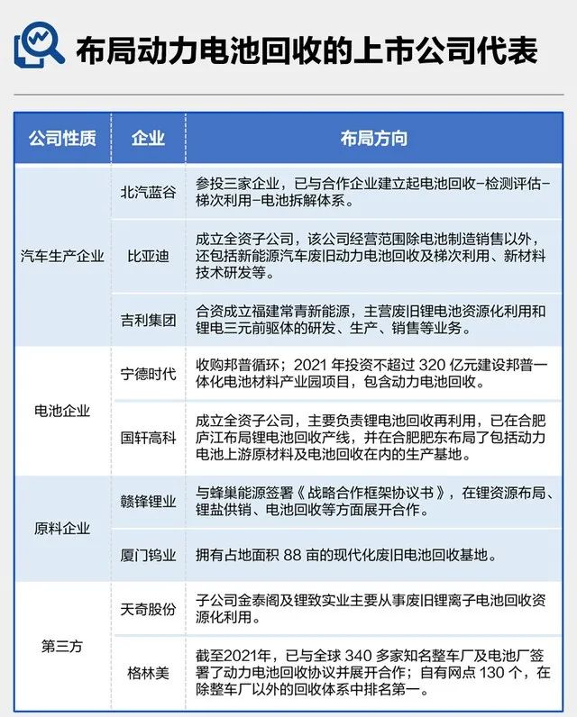 除此之外,特斯拉、比亚迪等行业巨头及众多中小企业也纷纷加码动力电池回收行业。