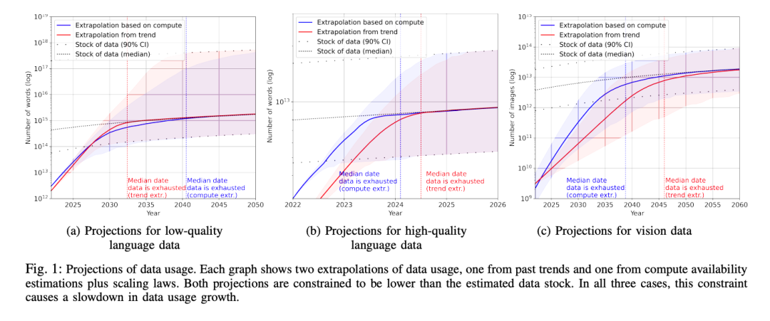 从数据供给的角度看,《Will we run out of data? An analysis of the limits of scaling datasets in Machine Learning》(P Villalobos, J Sevilla, L Heim, T Besiroglu, M Hobbhahn, A Ho [University of Aberdeen &MIT &Centre for the Governance of AI &University of Tübingen] (2022) )的估算结论是到2026年左右,高质量的NLP数据将会用光,低质量NLP数据会在2030到2050年用光,而低质量图像数据会在2030到2060年用光。
