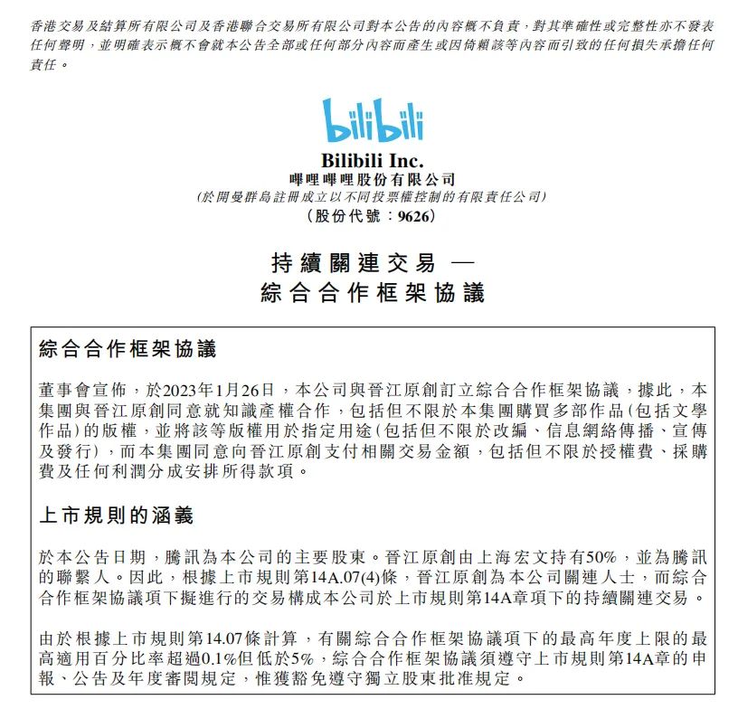 1月26日,哔哩哔哩在港交所发布公告,宣布与晋江原创订立期限三年的综合合作框架协议,双方就知识产权进行合作,包括但不限于购买多部作品版权,并将其用于改编、信息网络传播、宣传及发行等指定用途。