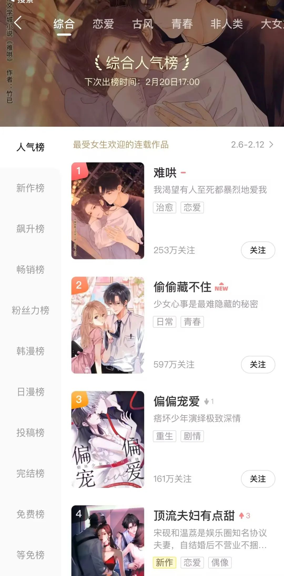 在新生代漫画阅读平台和兴趣社区快看,来自晋江的《难哄》《偷偷藏不住》《偏偏宠爱》等改编作品如今长驻人气榜前列,这些条漫、漫剧塑造的角色,成为了许多读者心中的理想形象。腾讯动漫、哔哩哔哩漫画、爱奇艺啪嗒、漫客栈等平台,也会通过不同风格、主题的独家内容,来满足女性用户的需要。
