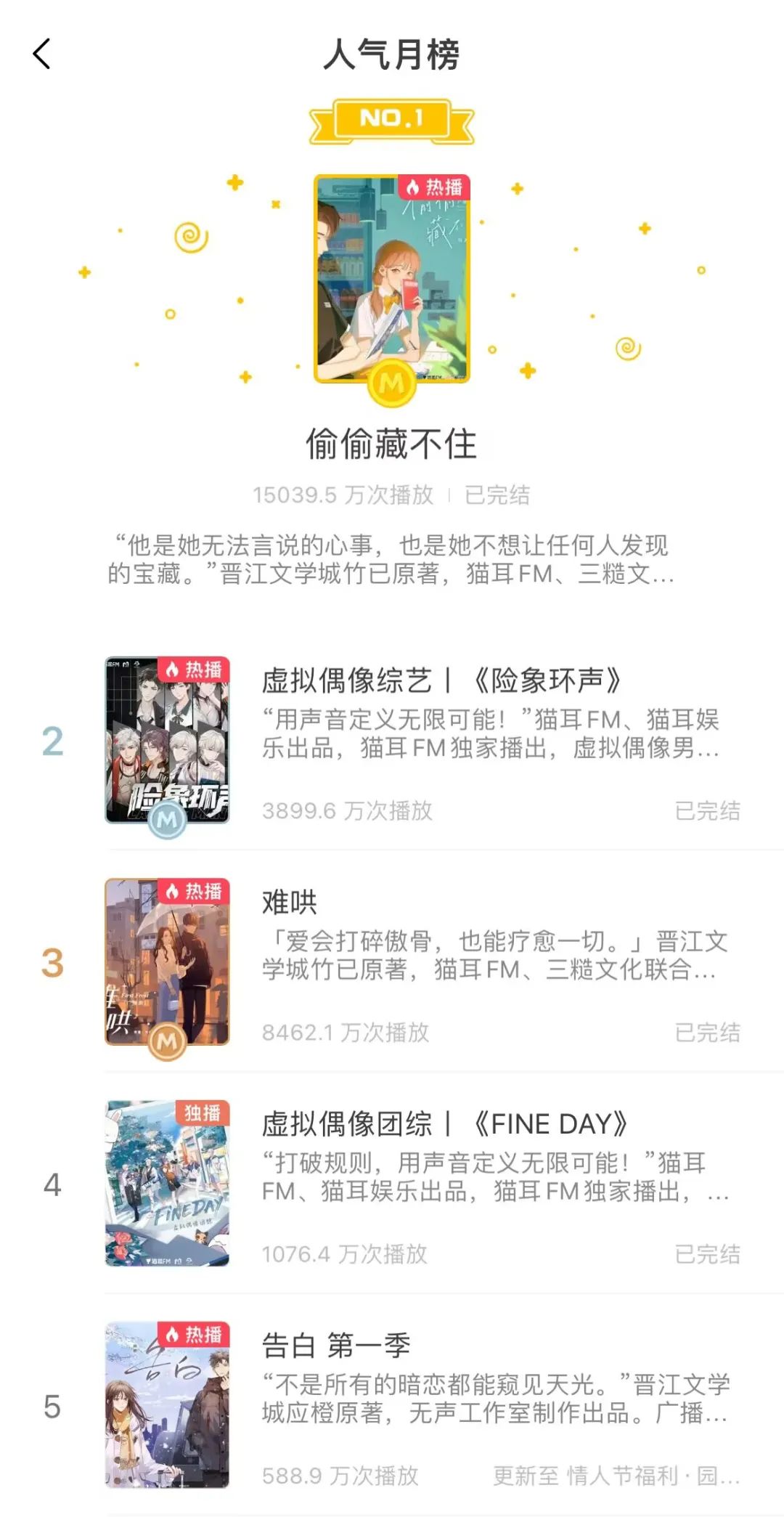 漫画之外,女性声控的厨力同样满点。B站旗下的音频社区猫耳FM,女性用户具备付费意愿,女性向有声漫/书、广播剧等颇受欢迎,旗下两个虚拟偶像男团也已经积累起不少粉丝。该平台上改编自晋江连载小说《魔道祖师》《默读》《偷偷藏不住》等作的同名商配广播剧、网配广播剧《二哈和他的白猫师尊》,以及猫耳娱乐虚拟偶像男团的音综,均收获了总播放量破亿的成绩,处于平台头部。