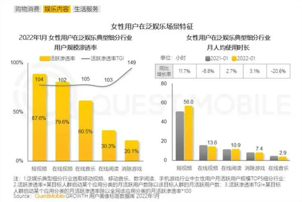 若跳出ACG内容,放眼短视频、社交平台、真人影视剧等大众关注的领域,年轻女性用户更是愿意投入自己的时间。根据QuestMobile数据显示,截至2022年1月女性活跃用户规模达5.82亿,同比增长2.3%。女性用户对于头部短视频类APP平均每天使用时间接近2小时,女性向内容较为丰富的在线视频平台紧随其后。