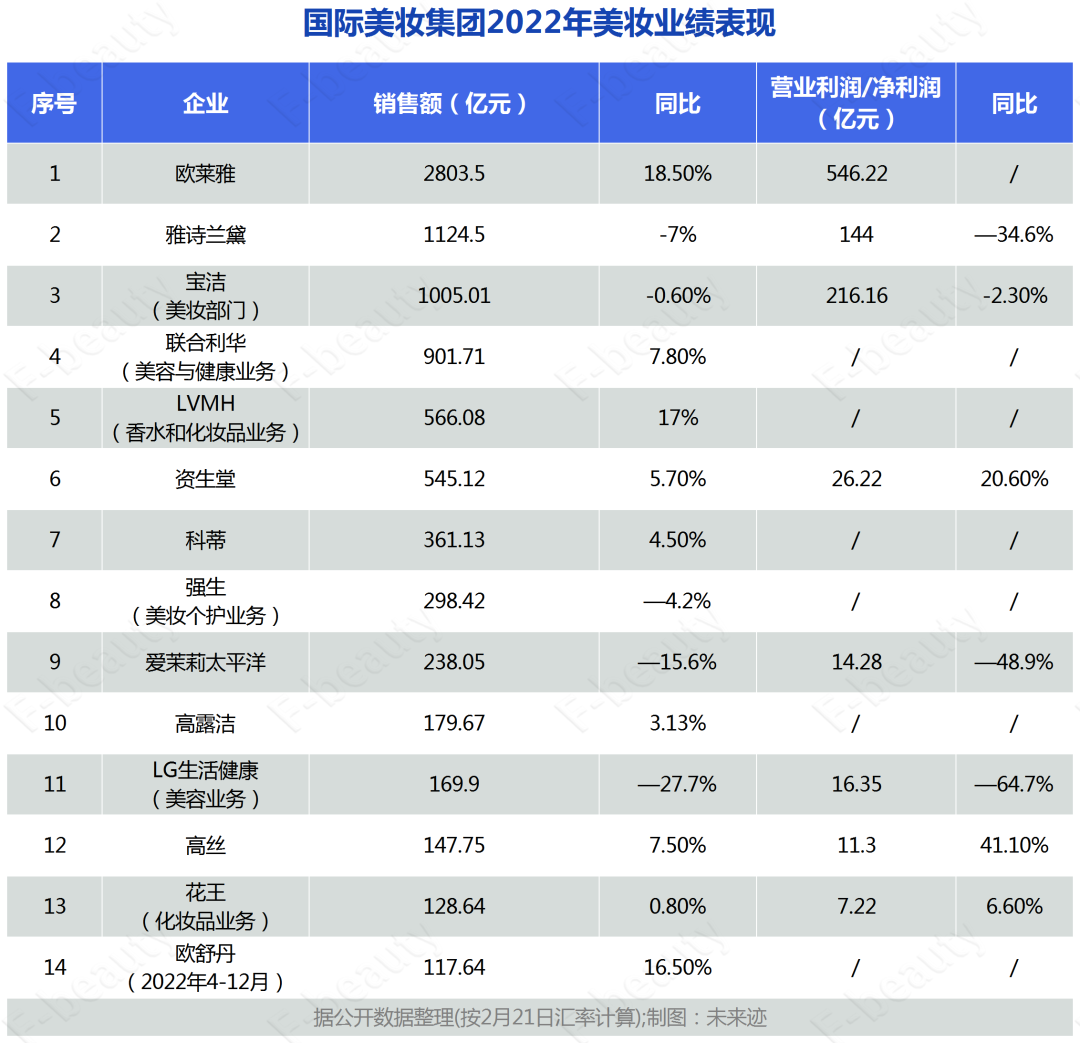 近期,欧莱雅、雅诗兰黛、宝洁、资生堂等14家外资美妆集团陆续发布了2022年业绩报告,又一年的角逐落下帷幕。据《未来迹Future Beauty》统计,2022年全年,全球14大美妆集团实现销售额共计8587.12亿元,数字背后反映的市场趋势值得关注。