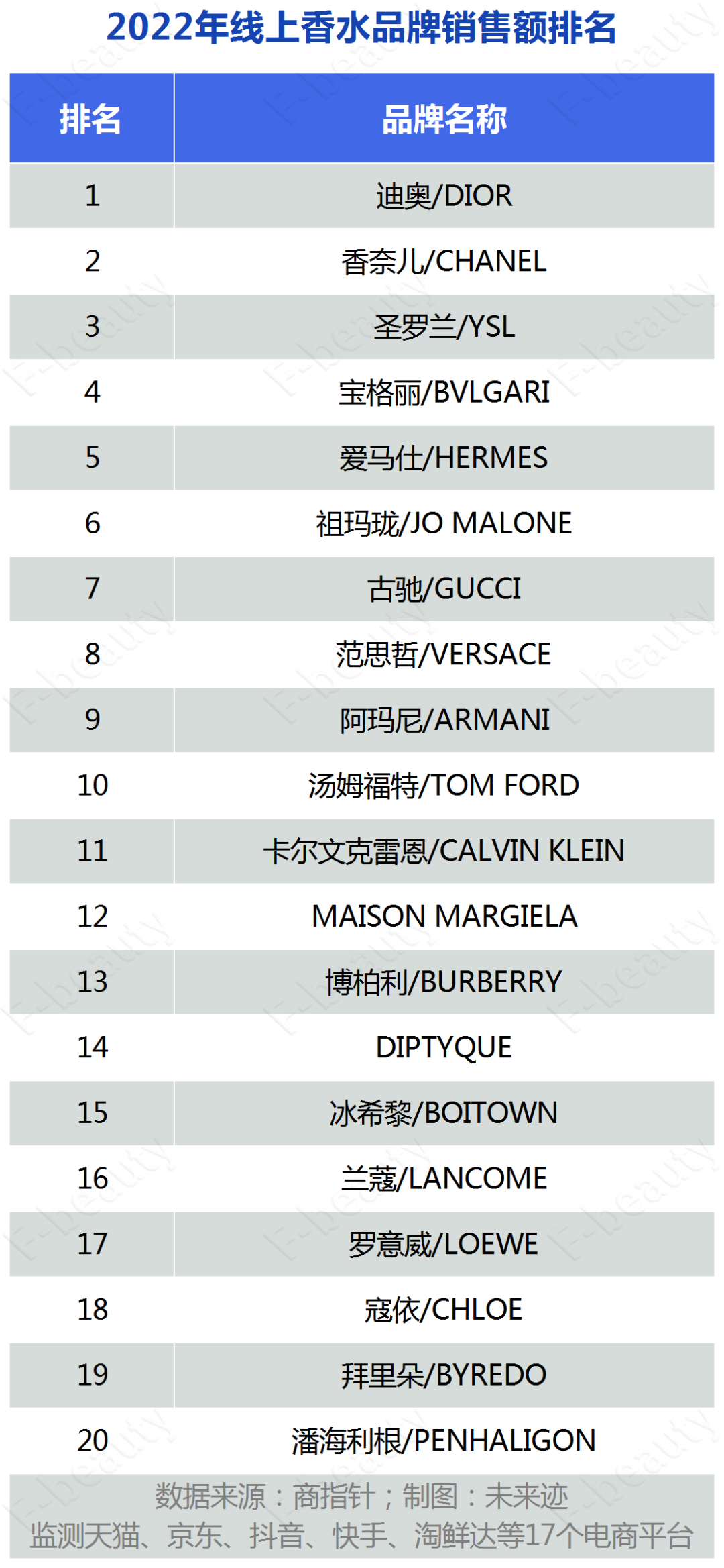 基于汹涌的香水浪潮布局,这些跨国美妆集团也获得了不小的回报。据「商指针」对天猫、京东、抖音等17个中国电商平台监测的数据来看,2022年中国线上香水销量排名的TOP20榜单中,海外香水品牌几乎包揽了全部席位。
