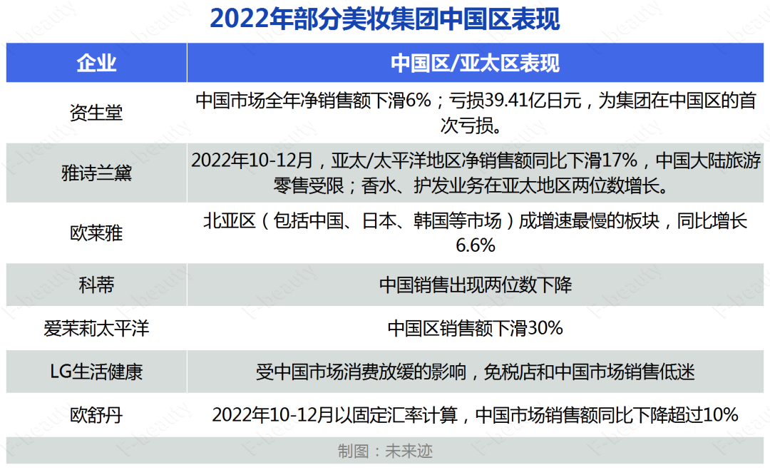 可以发现,作为从前的“掘金宝地”,2022年大多数外资化妆品集团却在中国市场遭遇“滑铁卢”。