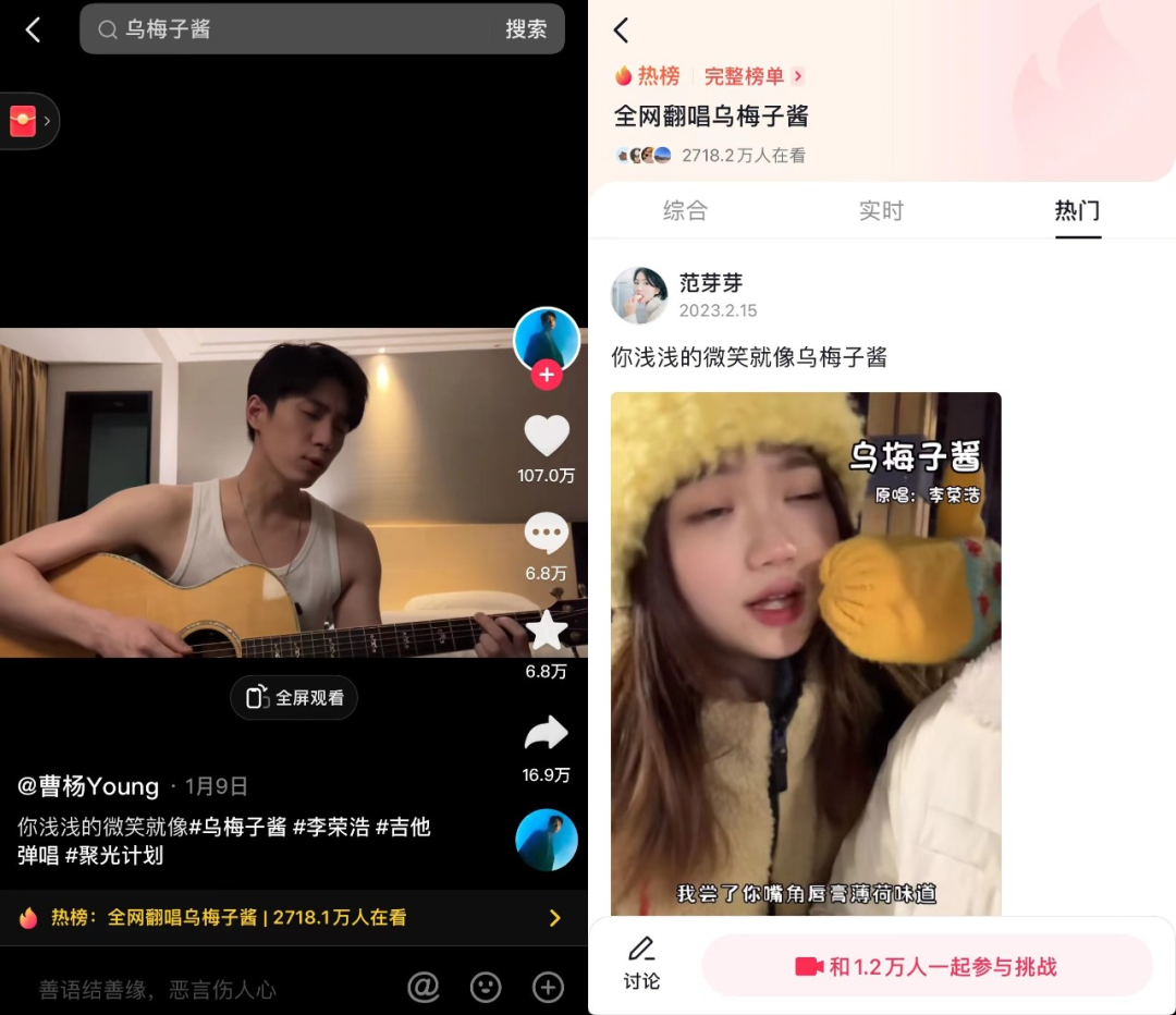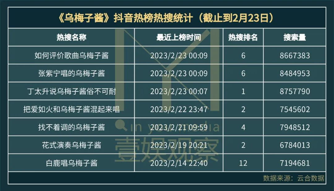 事实上,《乌梅子酱》早在歌曲刚刚发布的11月份登上过几次各平台热搜,并在今年1月被“小六子”曹杨等艺人翻唱,并在小范围内火了一把。