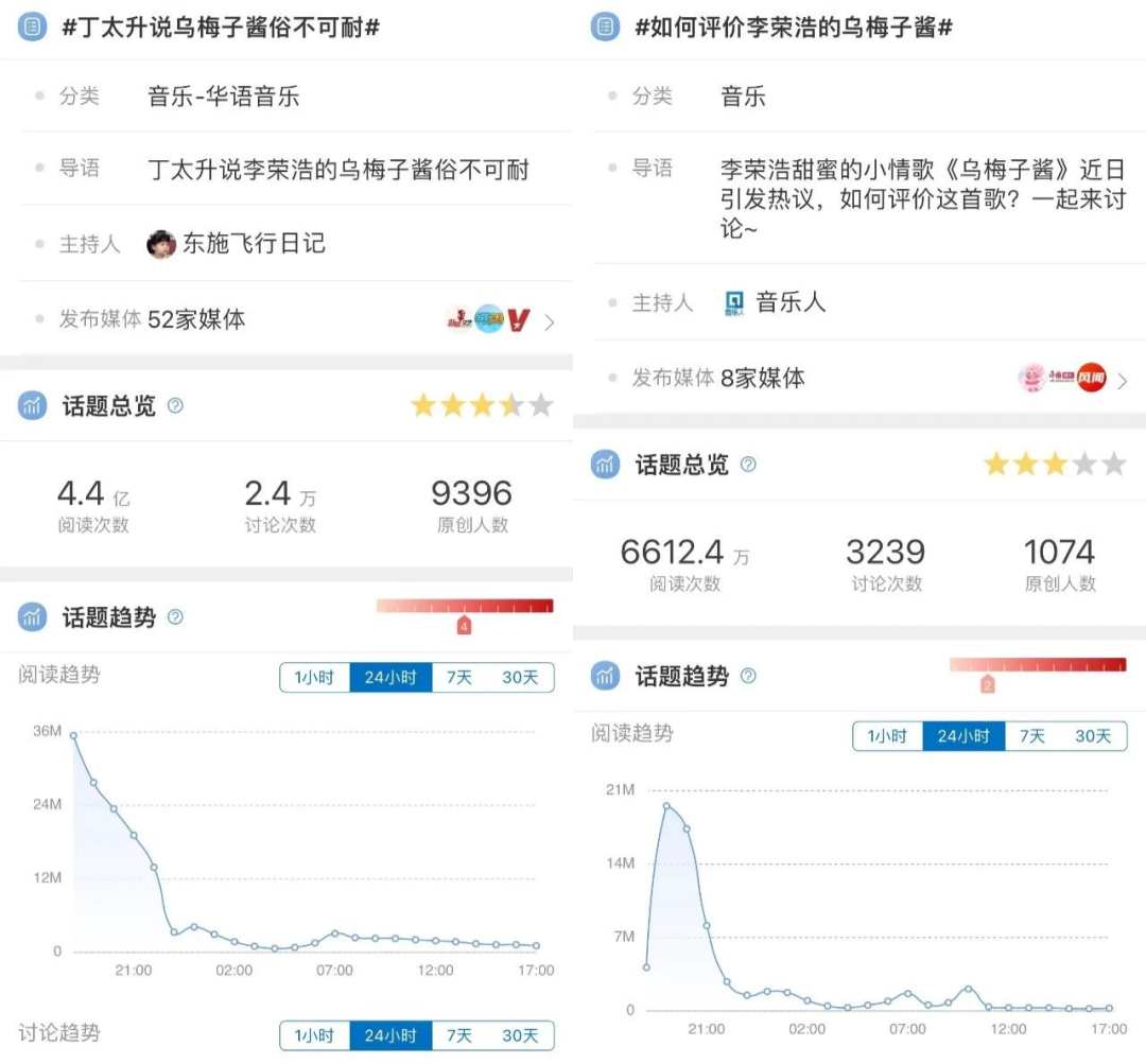 随后,音乐圈里的乐评人们发起了对于《乌梅子酱》是否过于口水歌和俗气的辩论,代表性人物丁太升的一条视频突然“出圈”,#丁太升说乌梅子酱俗不可耐#登上了微博热搜第一位。根据微博前端数据显示,截止22日晚间,这条热搜阅读量已经高达3.7亿,形成了2.1万次讨论,#如何评价李荣浩的乌梅子酱#也在同一天以1.9亿阅读量登上热搜。