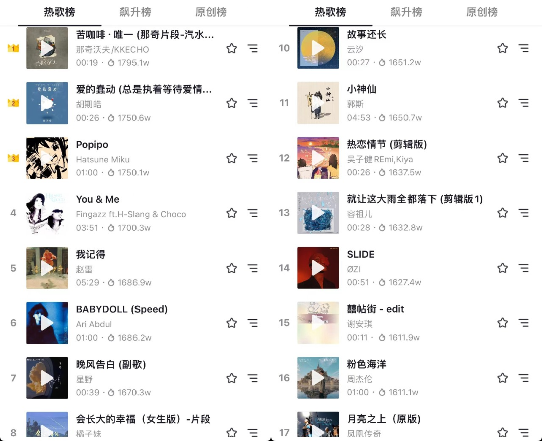 不仅是发布于2022年底的《乌梅子酱》火了,根据抖音音乐榜更新于2月17日的数据显示,抖音热歌榜排名第一的《苦咖啡 唯一》和排名第二的《爱的蠢动》均发行于2023年,排名第三的《Popipo》和第五名《我记得》均发行于2022年。而在去年,《阿珍爱上了阿强》《寂寞沙洲冷》和《看得最远的地方》等经典老歌翻新还占据音乐榜重要位置——新歌的推荐频率与过往翻新老歌的特点相比,有了显著不同。