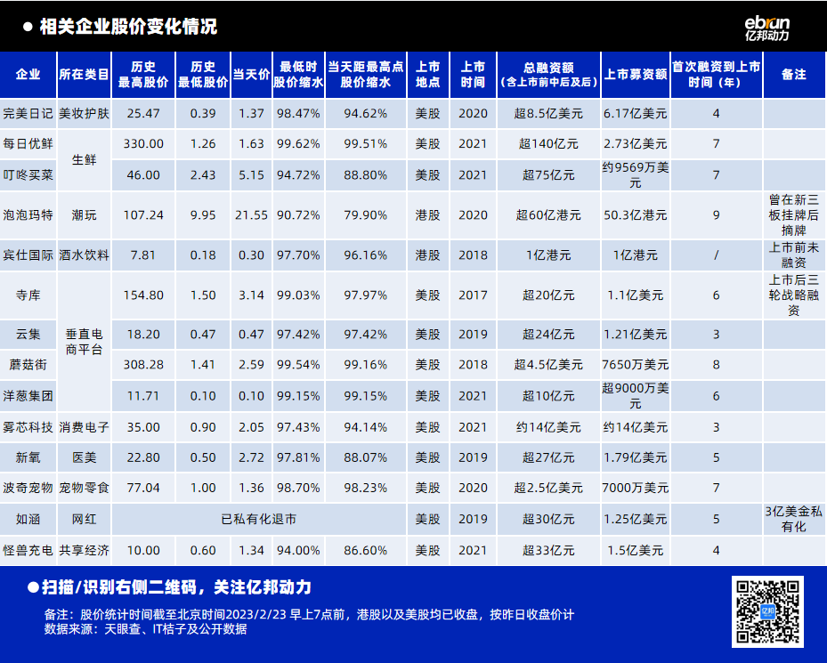 凶险远不止于此。据亿邦动力不完全统计,2017年以来,至少有14家在美股和港股上市的新消费企业,其股价最低时距巅峰跌去九成左右;即便一些企业的股价后续上扬,但截至统计时仍较最高时跌去超75%。这些企业主要分布在美妆护肤、生鲜电商和潮玩等赛道。