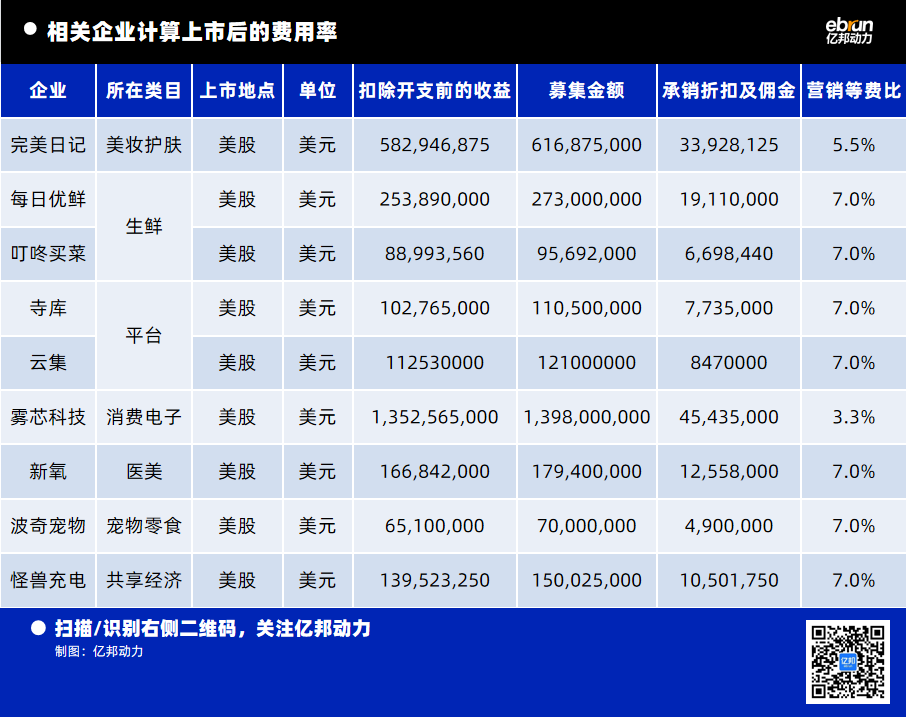 亿邦动力发现,上述9家企业中,叮咚买菜、每日优鲜、寺库、云集以及新氧等7家企业,其上市的营销等费比均为7%,雾芯科技上市的营销等费比为3.3%,当然其募资金额最多,达到了13.98亿美元,远超其他企业。这也符合募资规模越大,上市费比越低这一规律。