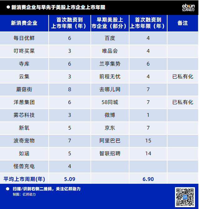 亿邦动力对比了两波赴美上市企业的上市周期(首次融资至首次境外IPO的时间周期),2017年以后上市的新消费企业,以及2015年以前上市的互联网企业,发现2015年之前上市的10家中概股企业,自首度融资起平均的上市年限为6.9年,而2017年之后上市的新消费企业,平均周期仅为5年,周期缩短了21.7个月多,后者的上市进程大大加快。