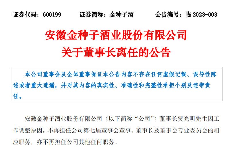 金种子酒(600199.SH)日前公告,董事长贾光明因工作调整原因,不再担任公司第七届董事会董事、董事长及董事会专业委员会的相应职务,亦不再担任公司其他任何职务。