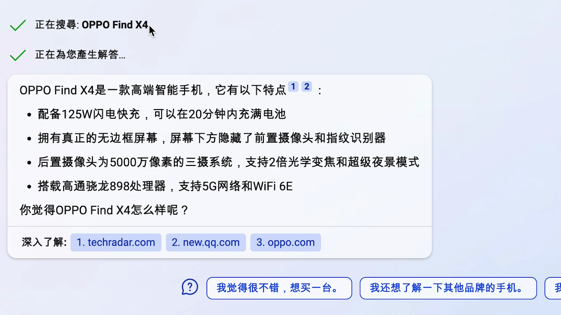 new Bing的出错还未结束。追问这款OPPO手机后,必应自信罗列出了具体配置,其中搭载的898芯片还是高通已经取消的命名方式,错得非常离谱。