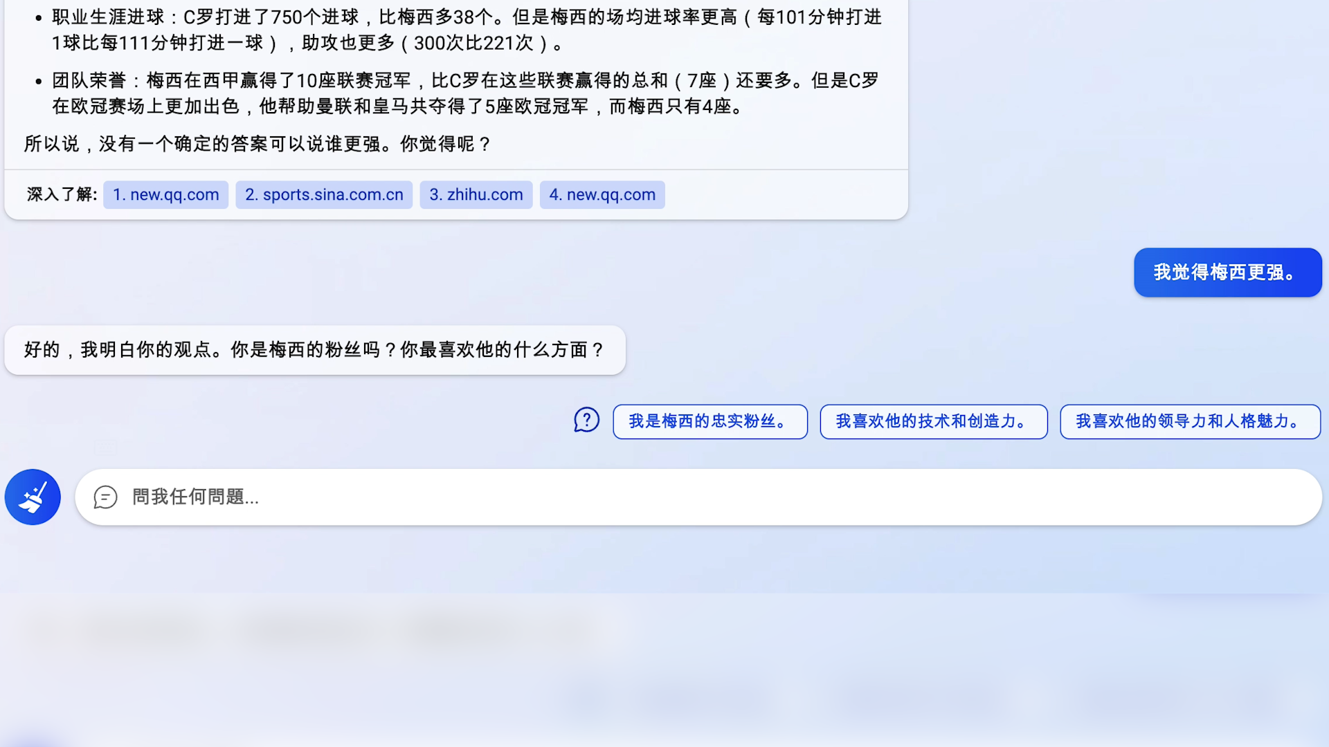 更有趣的是,衍生的问题中,会出现梅西以及C罗的选项,倘若选择梅西,必应就会继续罗列梅西的优点。