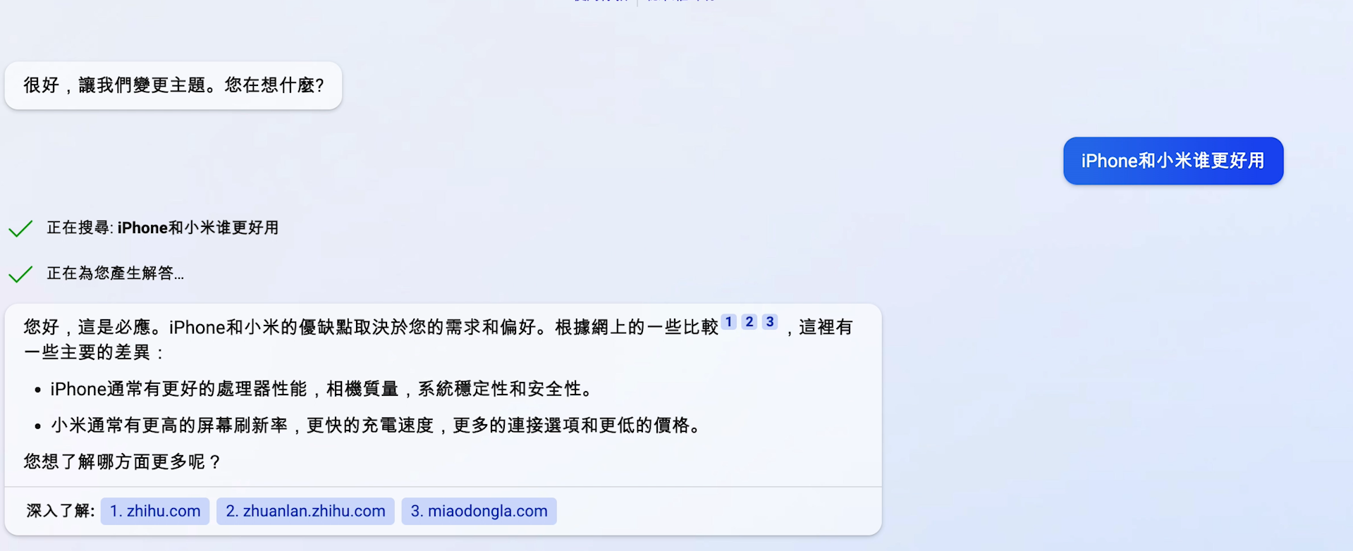 当我又提问“小米与iPhone谁更好”时,新版必应同样选择了辩证法则,但数码爱好者也能发现,这是一个还算过得去但不能深究的答案,但这也再次印证,面对主观性很强的提问,new Bing不会下任何有倾向的判断。