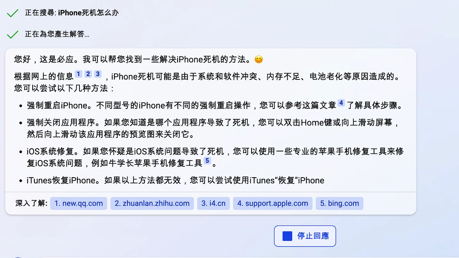 又比如我提问“iPhone死机了怎么办”,new Bing既会引用iPhone官网的参考资料,又会推荐山寨软件进行修复,水平只能说参差不齐。