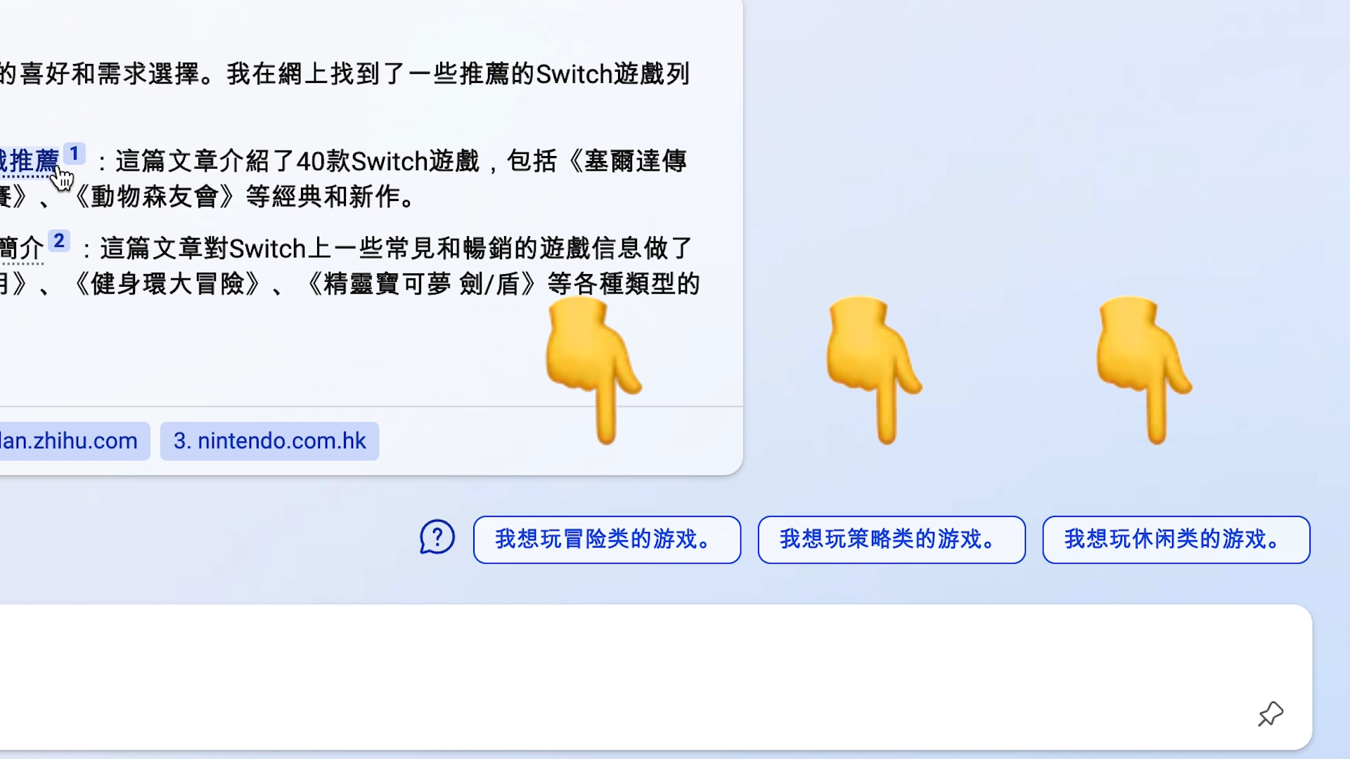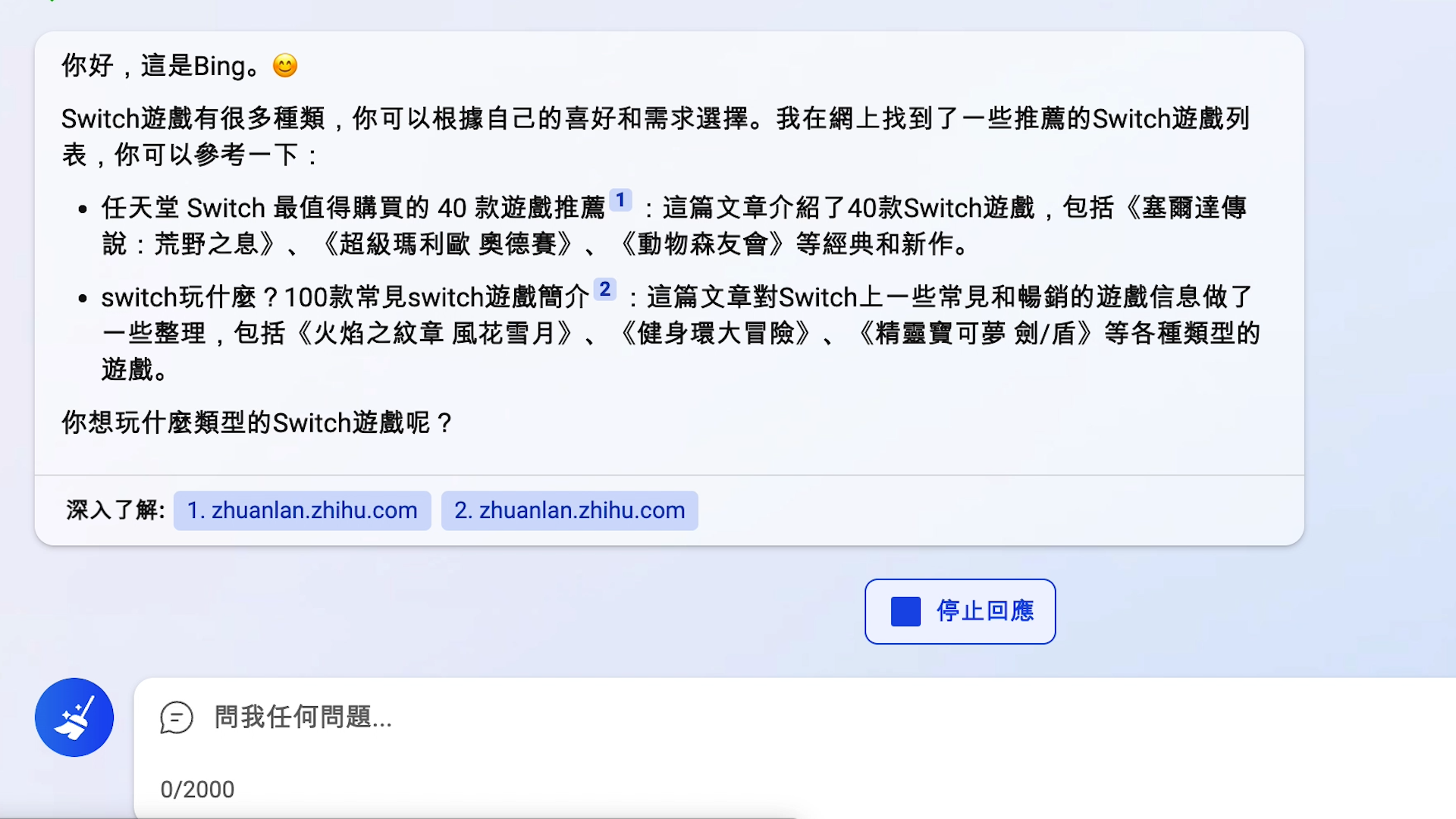 此功能下必应提供了对话式的搜索界面,我首先输入了“推荐switch游戏”。