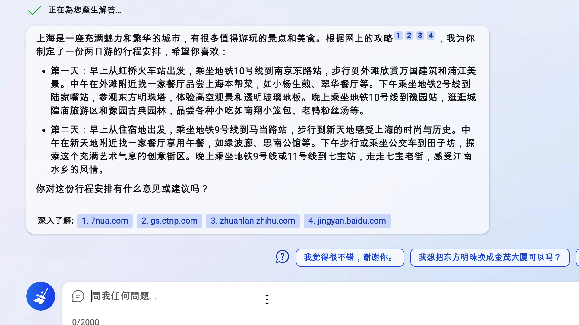 新版必应给出了外滩、东方明珠、新天地这些常规景点,并且附上了交通路线以及美食推荐,虽然这份“上海两日行程”远不及小红书等App上的详细攻略,但作为AI的答案,其可行性还算靠谱。
