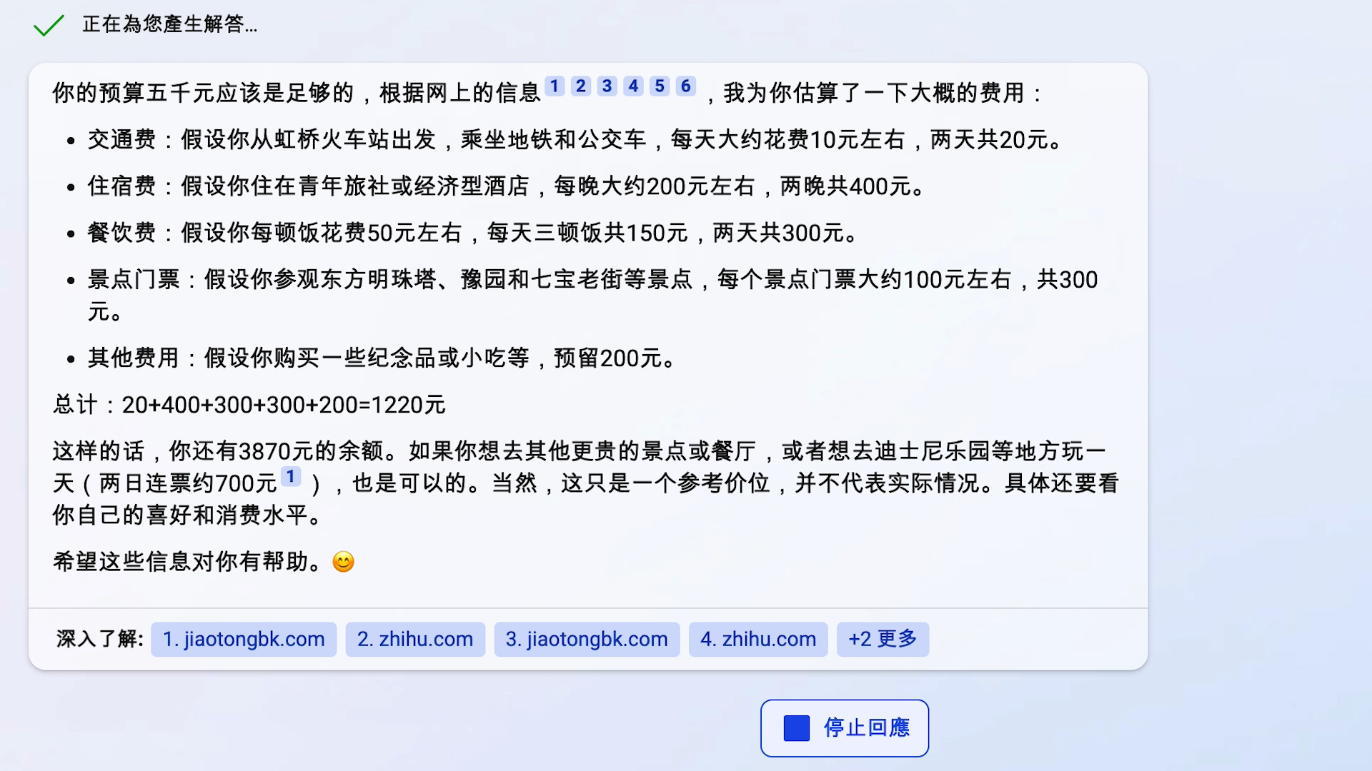 但是new Bing并没有回答五千预算的规划,继续提问以后,根据它刚才自己的回答,必应大致计算出了交通、餐饮以及住宿的费用。