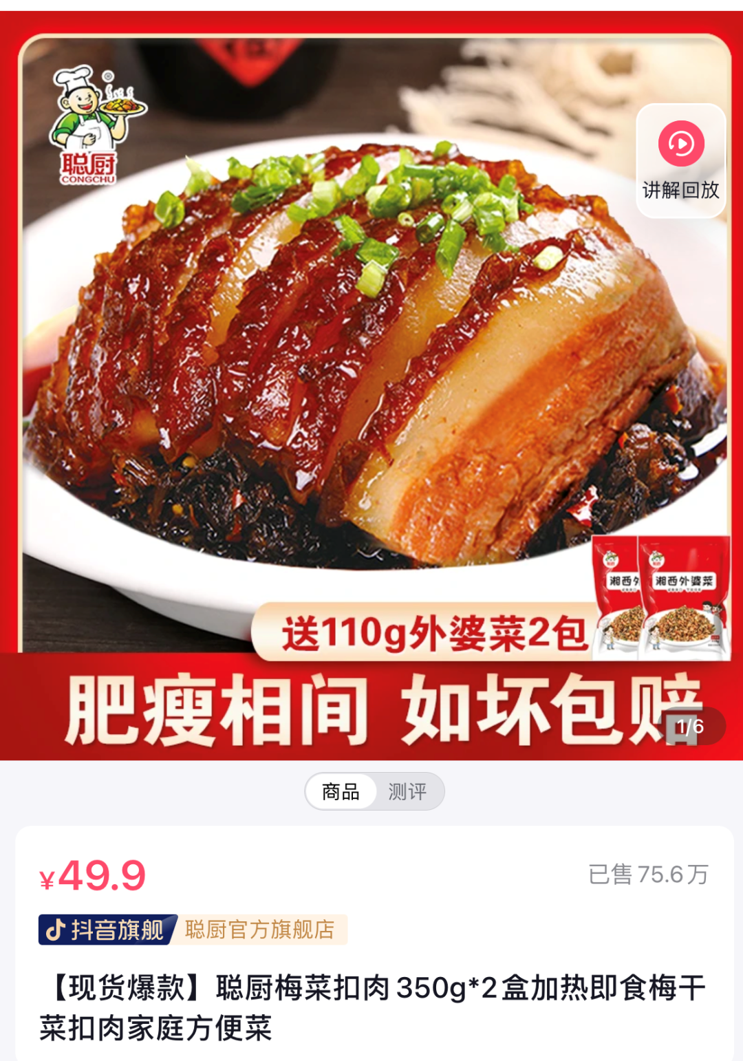 抖音账号聪厨官方旗舰店显示,单是350g*2盒这一规格的梅菜扣肉预制菜产品,销量就已经超过75万份。而408g*2盒规格的乡里梅菜扣肉,销量也逼近15万份。其董事长张鹏飞曾透露,梅菜扣肉王该款产品自2019年推出后,年销售额已经超过5000万。