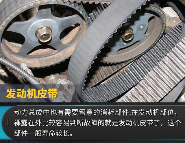 动力总成中也有需要留意的消耗部件,在发动机部位,裸露在外比较容易判断故障的就是发动机皮带了,这个部件一般寿命较长,一般在SSSS店会在5-6万公里大保养的时候会进行更换。而在日常使用时,可能会因为机身上各介轮以及涨紧轮的故障产生异响,所以这也是发动机机身上一个比较聪明的物理预警发声器。