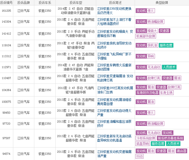 另外,根据懂车帝调查大数据显示,在各大汽车投诉网站上,目前有大量车主针对驭胜S350的发动机问题进行投诉,另外还包括转向异响、变速箱漏油等问题(见下图,截图来自车质网)。