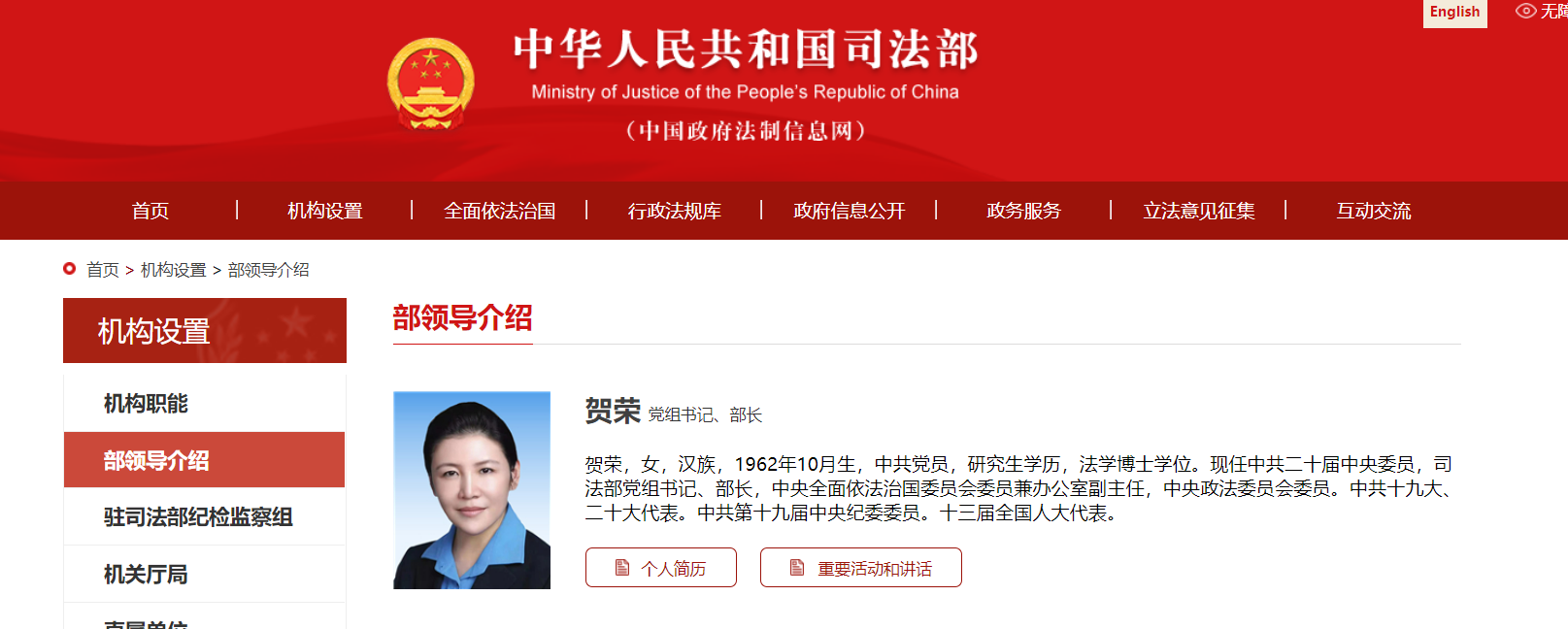 司法部网站2月24日更新“部领导介绍”信息显示,贺荣已任中央政法委员会委员。