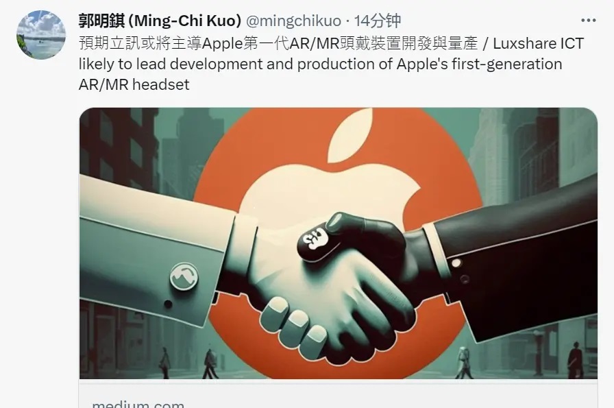 知名苹果分析师郭明錤2月24日表示,和硕可能预计将AR/MR开发团队与生产资源在1H23转移至由和硕与立讯合资的立铠。因立铠由立讯主导,等同由立讯接手该产品后续的设计与生产。这样的变化有利后续加速降低头戴装置成本,也是Apple所期待看到的。因为Apple的第一代AR/MR头戴装置预估出货量极低,因此此投资对立讯短期内可能很难创造获利。 Apple是立讯最大客户,立讯在2023与2024年的成长性完全仰赖Apple订单,故如果Apple期望立讯接手头戴装置,立讯很难拒绝此要求。