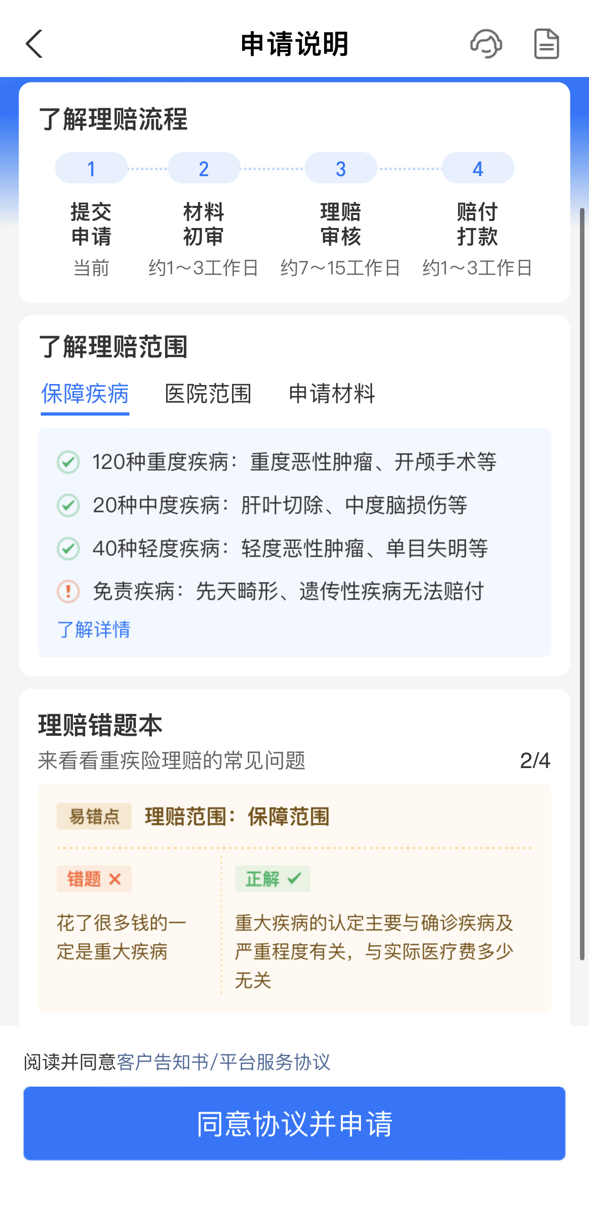 在理赔速度上,对于不同保险种类,入选“安心赔”的保司会约定理赔审核时效。门诊险、住院医疗险、意外险和重疾险的理赔时效保障,分别为2日、4日、5日和15日。一旦超过约定时效,用户可申请加急处理。
