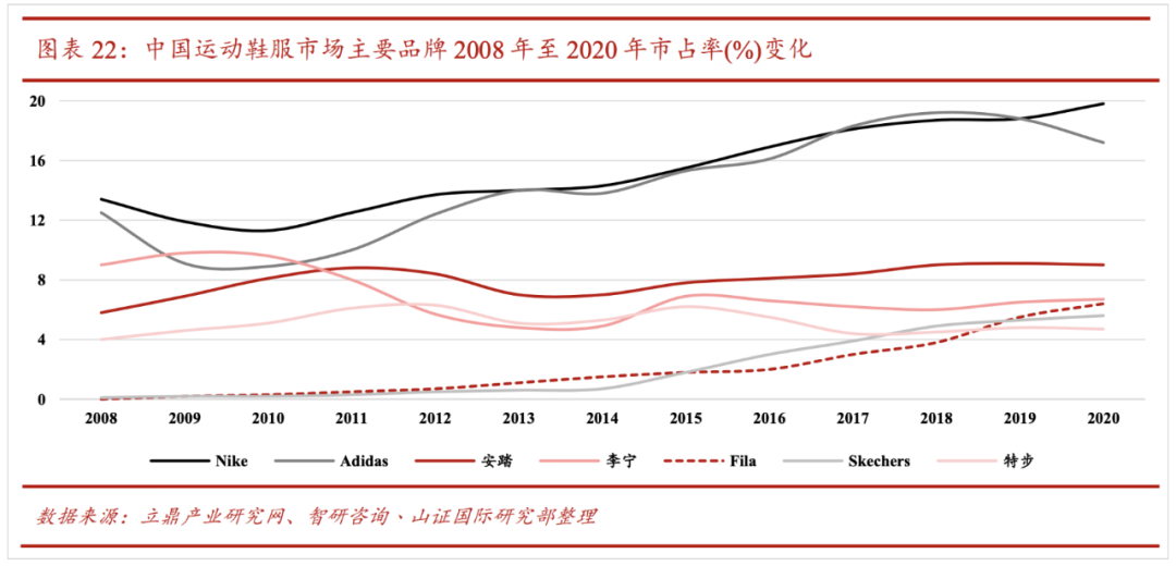海外来说,除了坐庄的阿迪、耐克,新晋竞争者如Lululemon等来势汹汹,靠着忠实的拥趸,保持着20%以上的高增速。