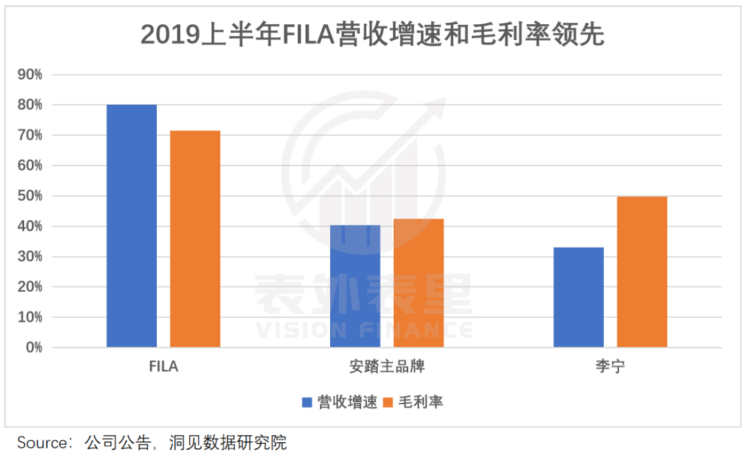 如下图,截至2019年上半年,FILA的营收增速和毛利率,远超安踏主品牌和李宁,妥妥的当红炸子鸡。