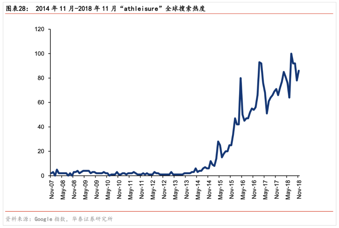 那时,全球范围内逐渐刮起运动时尚风(运行休闲风)。据Google搜索指数显示,“Athleisure”的全球搜索热度,从2013年开始迅速增长。